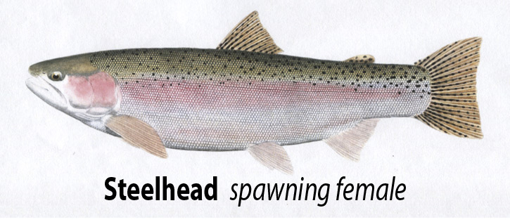 As Steelhead progress up-stream to their spawning grounds, they gradually assume the colors of non-migratory Rainbow trout, while maintaining their longer body shape.